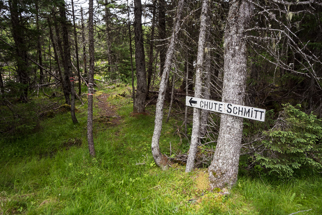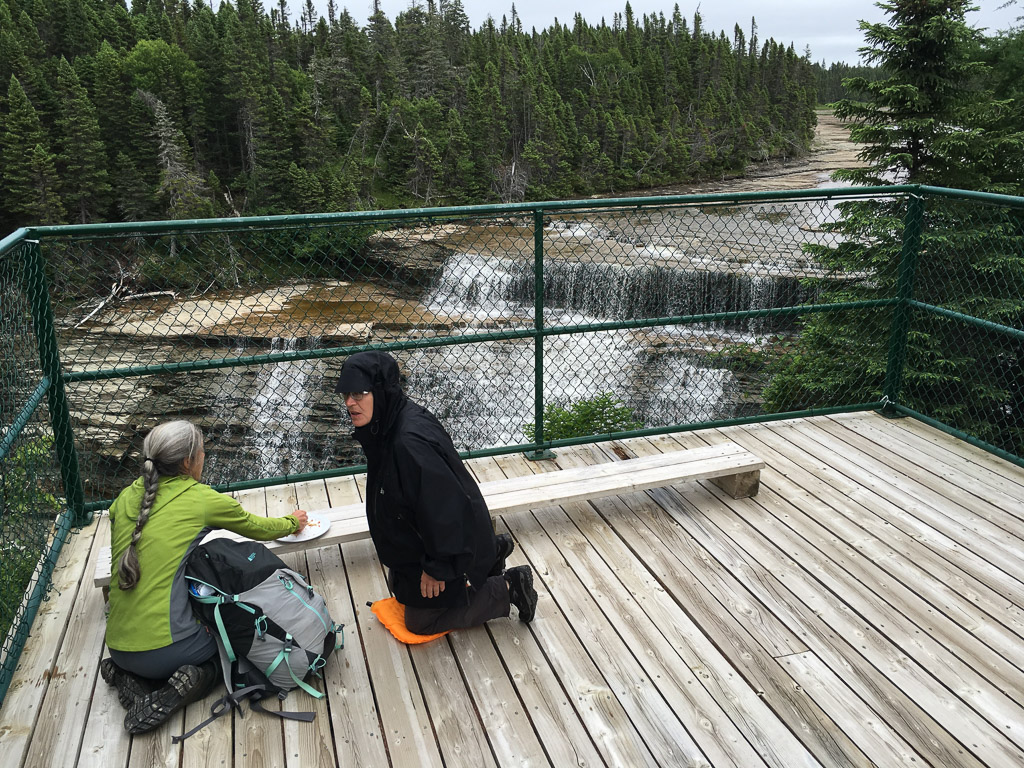 On dîne sur un belvédère à la chute Schmitt. Craquelins et tzatziki, crudités, pâté de cerf, confit d'oignons, jus de tomate. Il pleut de façon intermittente. De retour dans le véhicule, je dois recharger mes piles de caméra pour la première fois. Ma première carte de 32 Go est aussi bientôt pleine. La recharge se fait à l'aide d'un onduleur. C'est un dispositif qui convertit une source d'énergie continue en courant alternatif. Je peux donc brancher mon chargeur de piles et obtenir une recharge complète en environ 2 heures. Ça fonctionne bien.