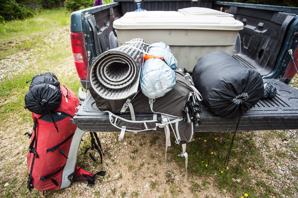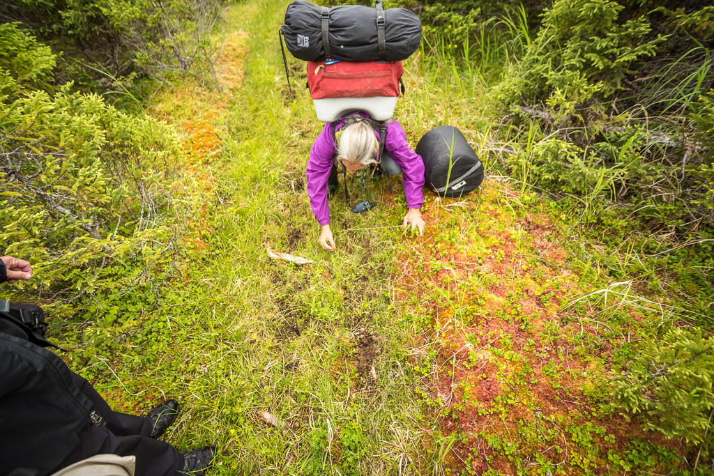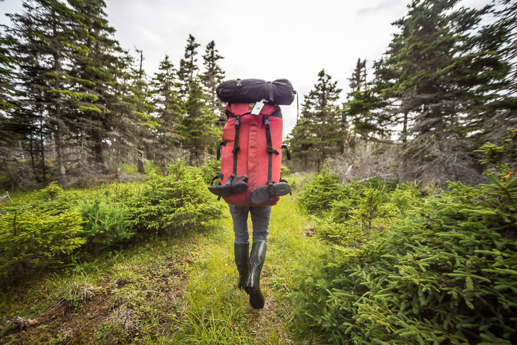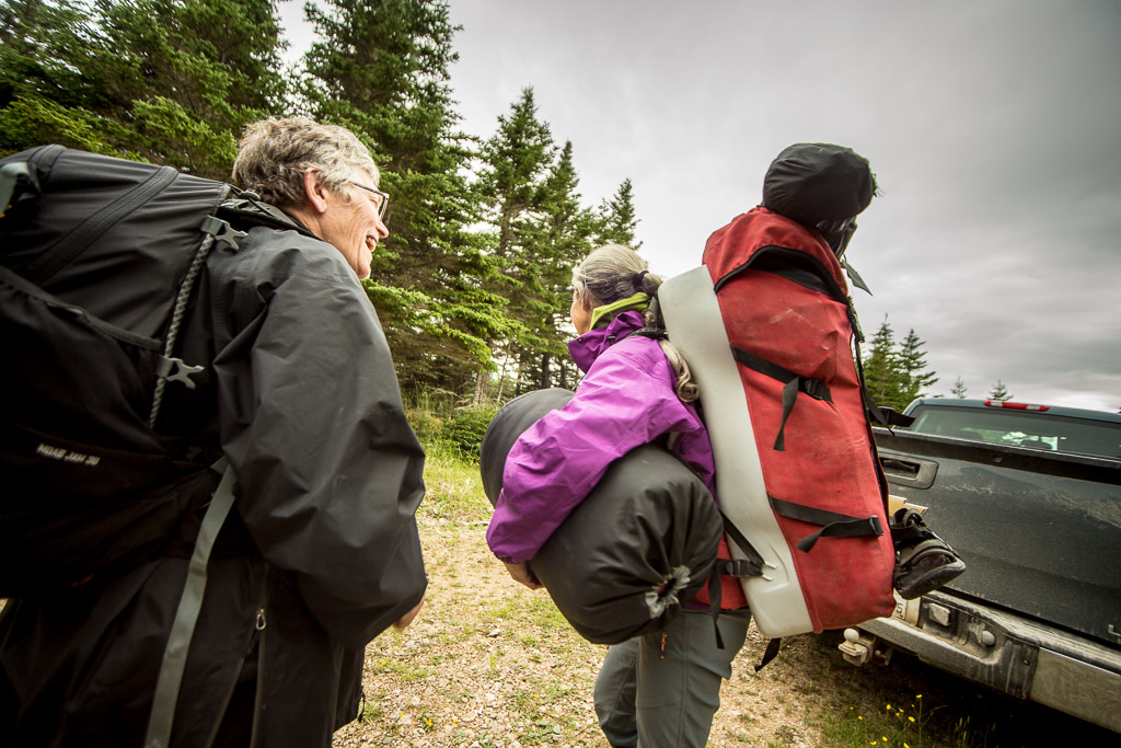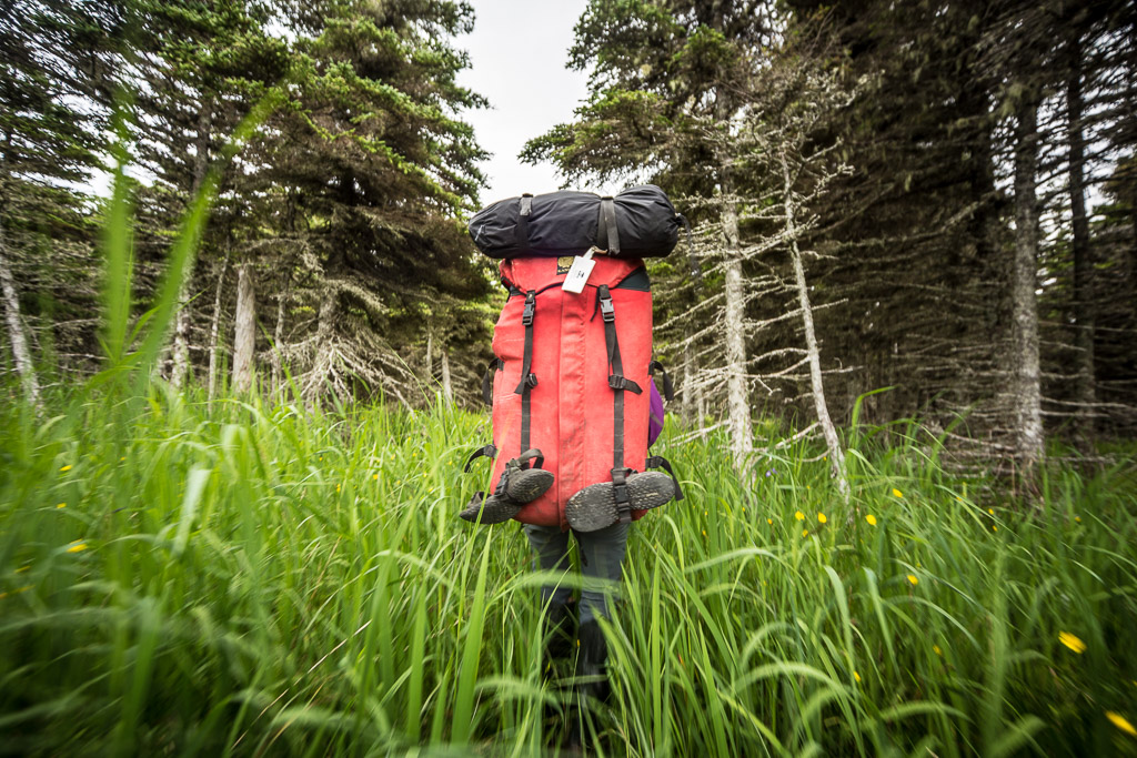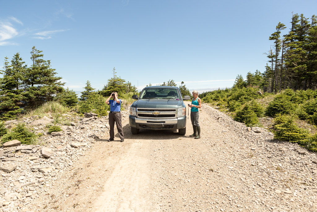 La route est longue, encore une fois. Sur le chemin de la rivière Bell, elle se déploie parfois en ligne droite à perte de vue. Il s'agit de sections de route qui ont été construites sur un ancien pipeline à l'huile, dans le temps de la première prospection de pétrole. On croise un employé de Safari Anticosti. Il regarde la carte avec Danièle et nous propose un chemin de marche qui sera meilleur, selon lui, pour accéder au phare. Il faudra effectivement marcher quelques kilomètres pour se rendre à l'escarpement Bagot. Aucun chemin carrossable ne s'y rend. Au bout de la route, passé le pavillon de la rivière Bell (camp de chasse), on traverse une piste d'atterrissage désaffectée et on prend à droite dans ce que j'appellerais en bon français une trail. Après environ 1 kilomètre, on aperçoit en sentier de randonnée à gauche. Il faut marcher à partir de là. On prépare tout notre matériel pour la soirée, la nuit et le lendemain. On y va pour le strict minimum puisqu'il faudra porter tout ça sur notre dos jusqu'au phare.