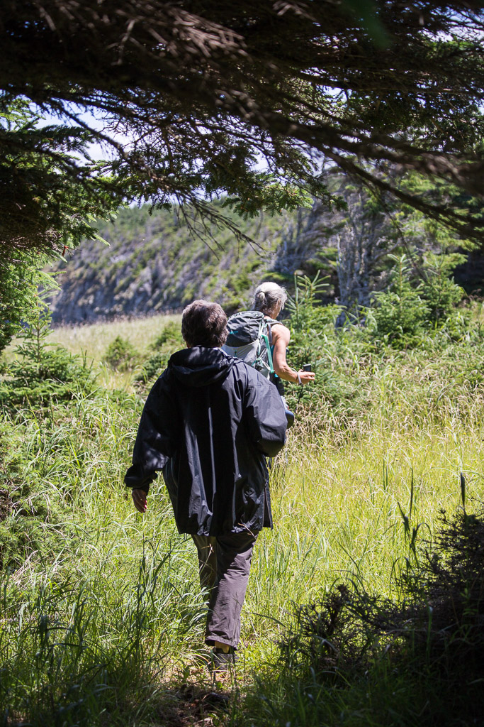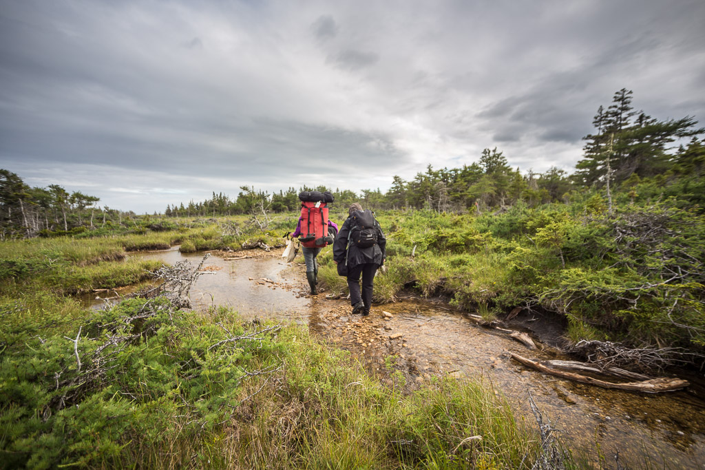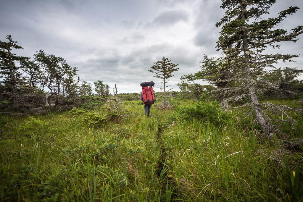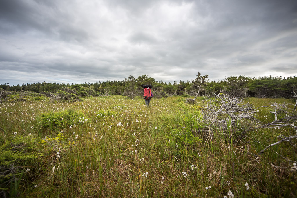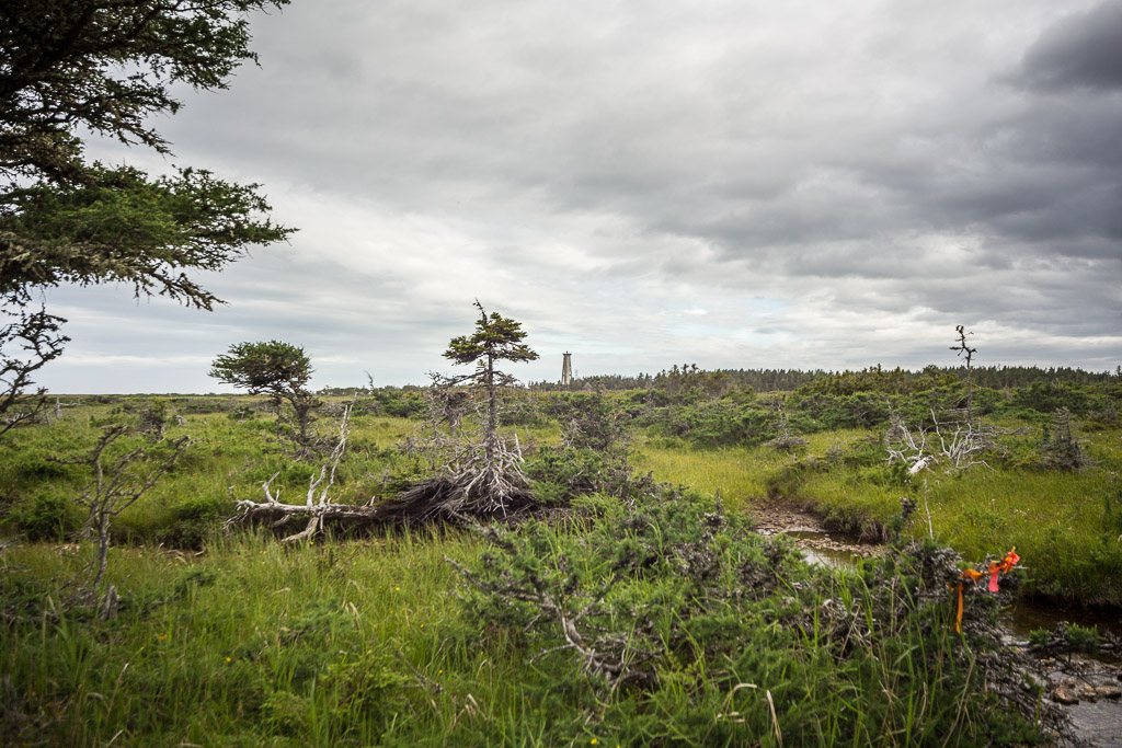 La randonnée dure environ 45 minutes. On marche à un bon rythme. On traverse une tourbière et c'est très humide pour les pieds. On doit franchir plusieurs petits ruisseaux, mais ce qui est le plus mouillant, ce sont les trous d'eau cachés dans les herbes hautes. C'est une fois rendu les pieds dedans qu'on découvre leur présence. À un certain moment, on aperçoit le phare à notre gauche, qui semble assez près. Mais le GPS indique qu'on doit traverser une zone encore plus humide si on veut y aller en ligne droite. Avec la pluie des derniers jours et la crainte d'avoir de l'eau jusqu'aux genoux, on continue vers le sud pour rattraper la mer et ensuite se rendre au phare en longeant la plage.