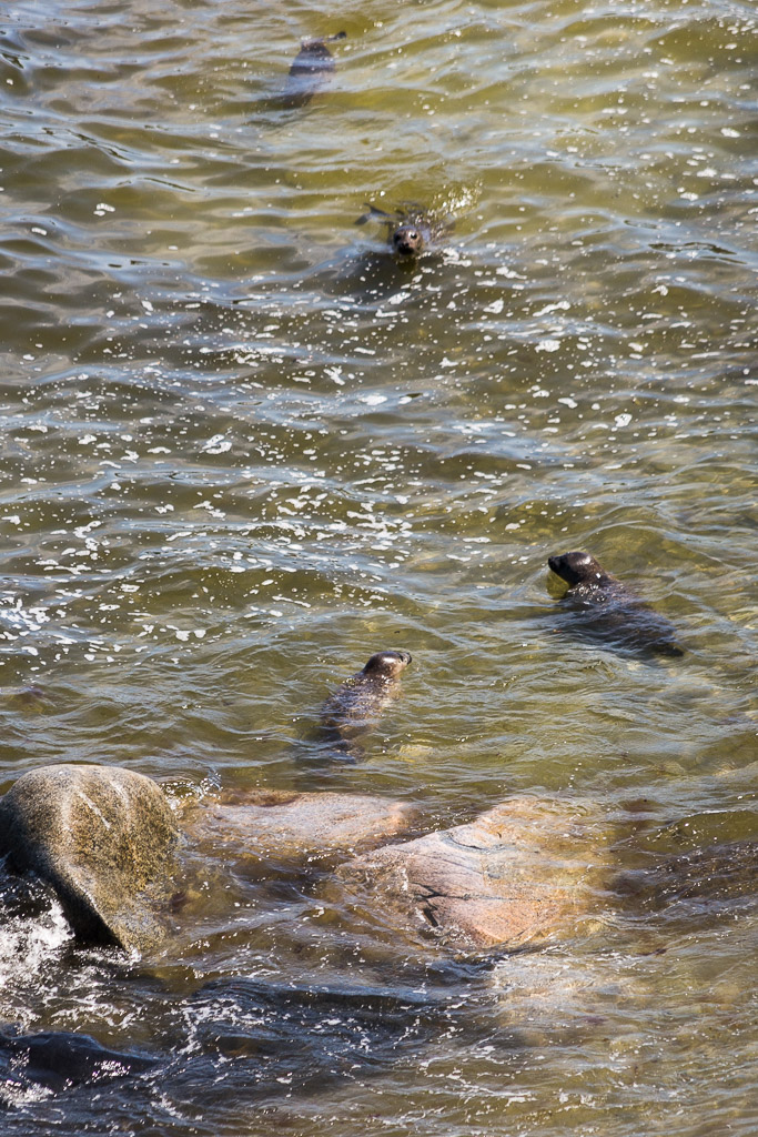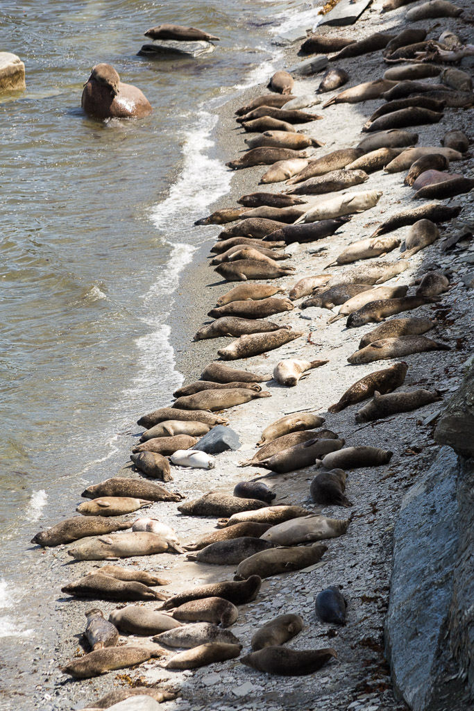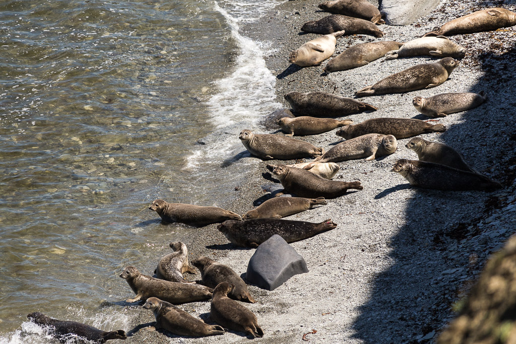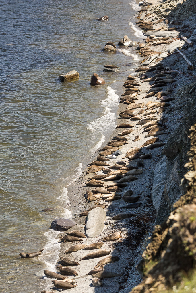 Le premier arrêt de la journée se fait à cap Tunnel. Après une courte marche dans un sentier, on aperçoit le tunnel: une pointe rocheuse avec un trou dedans, le « rocher percé » d'Anticosti. On s'approche du cap en continuant sur le sentier. En regardant en bas, sur la plage, j'aperçois plusieurs grosses roches rondes. Je vise dans mon objectif et je distingue parmi ces rochers un phoque en train de se la couler douce sur la plage. Mais je ne suis pas au bout de mes surprises. En prononçant les mots « il y a un phoque », je me rends compte que chacune des grosses roches rondes est en fait un phoque! Il y a, devant nous à quelques dizaines de mètres, une colonie d'environ 200 phoques! Ils sont mignons avec leurs petits visages tristounets. On passe plusieurs minutes à les photographier et à les admirer. Allégresse assurée!