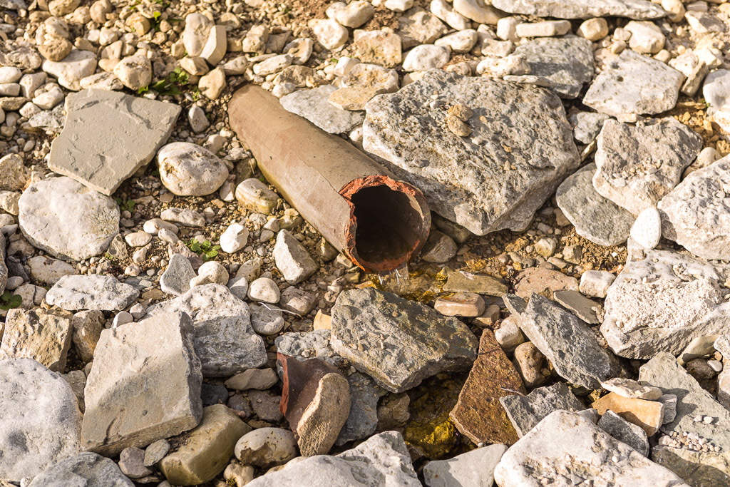 Pendant que Danièle cherche le meilleur lieu pour poser nos tentes, elle trouve sur la plage un tuyau en terre cuite encore fonctionnel qui semble provenir des anciennes maisons. De l'eau y coule toujours, vers la mer.