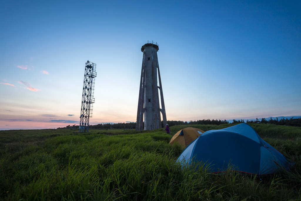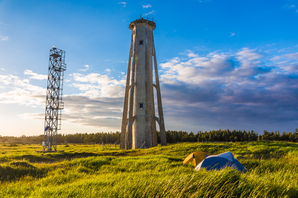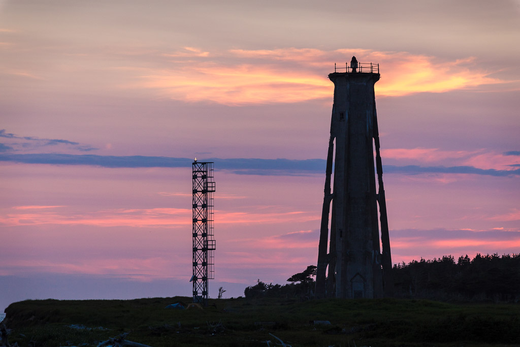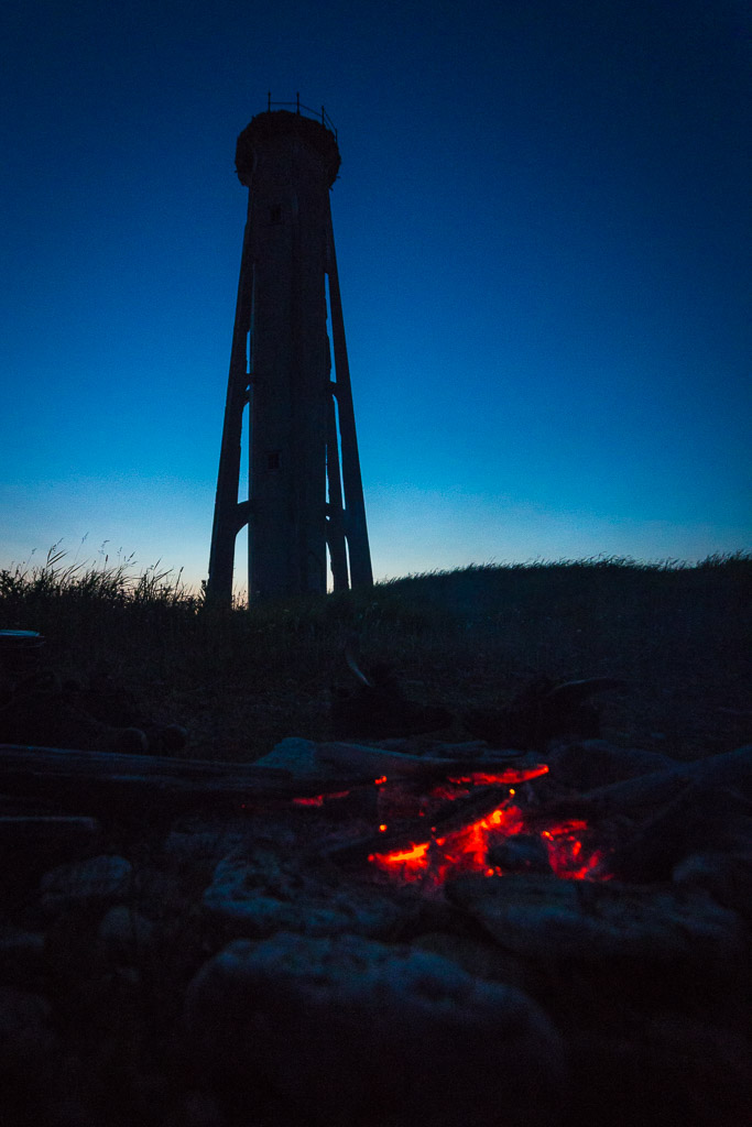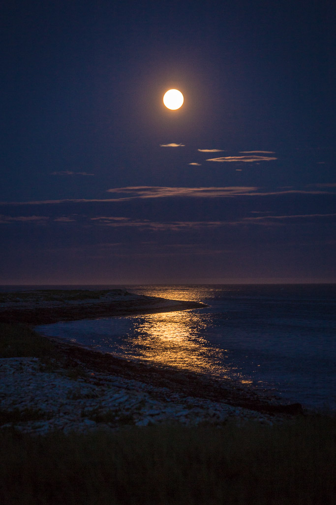 Je m'installe et prends quelques notes de la journée. Mais pas pour longtemps, le sommeil m'appelle. Je me réveille vers minuit et je prends une photo du phare sous les étoiles. Je m'étais installé un trépied et ma caméra avant de me coucher. Installés à l'intérieur de la tente, je n'ai eu qu'à ouvrir la porte et à appuyer sur le bouton pour avoir ma photo. Comme la lune est pleine, les étoiles sont difficiles à voir, même dans cet endroit sans aucune pollution lumineuse.