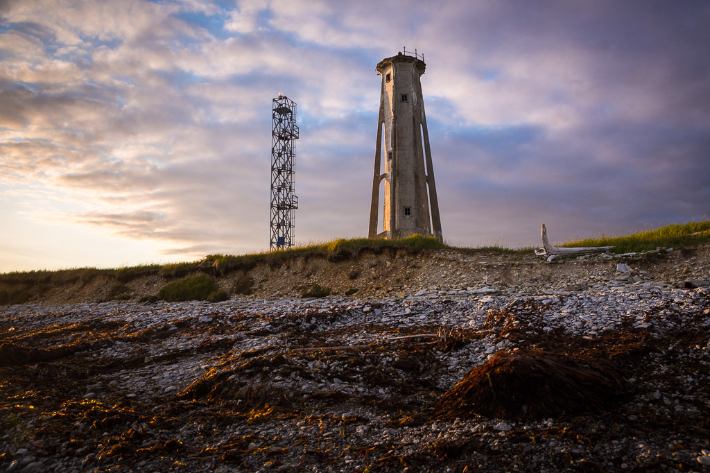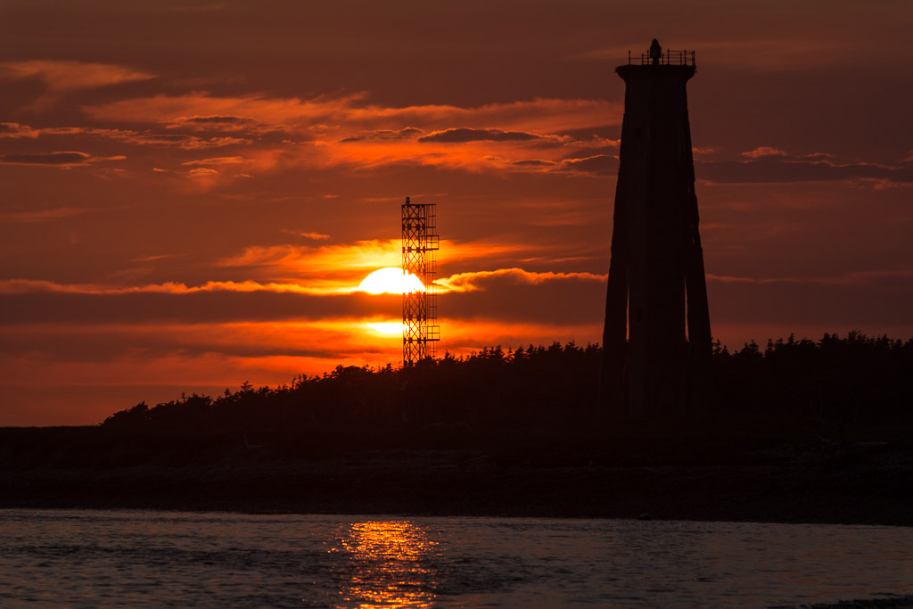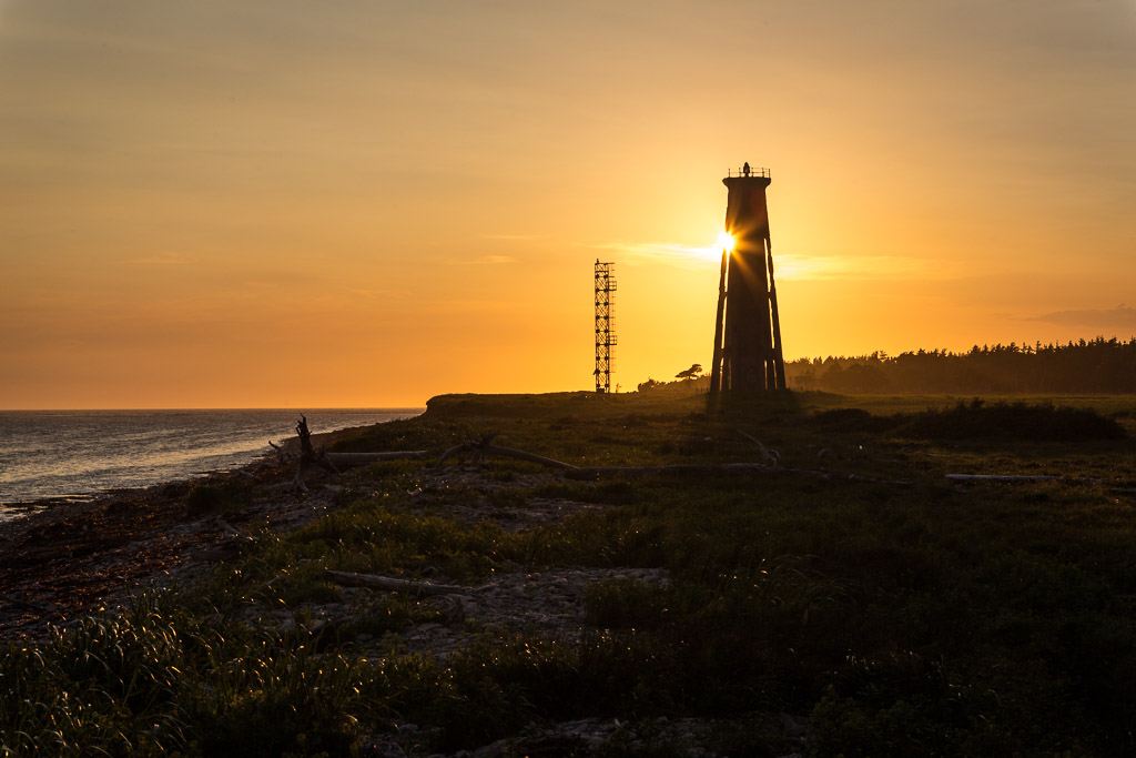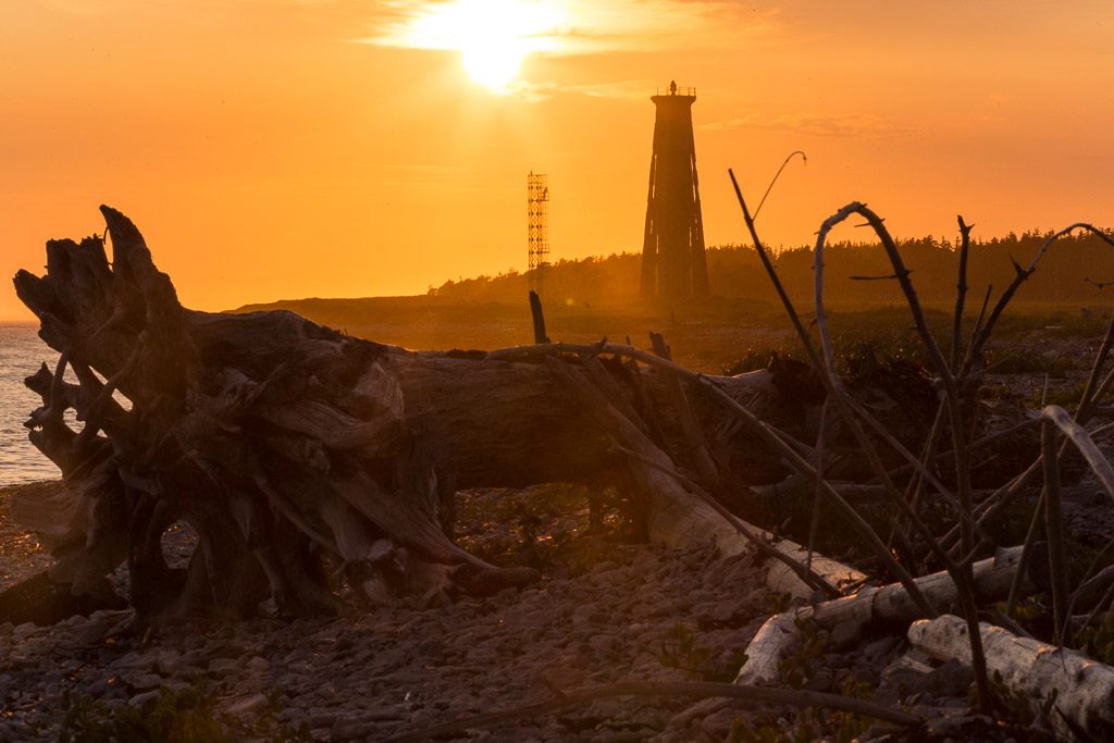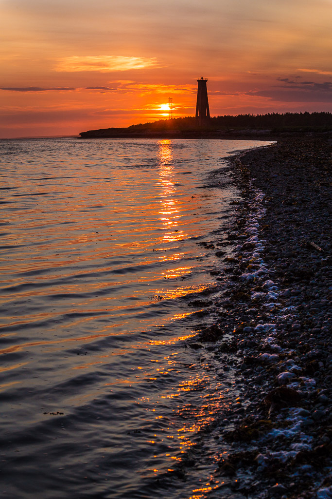 On soupe. Cassoulet sur le feu et un morceau de chocolat. Autre tournée photo jusqu'au coucher du soleil. Je marche en direction de la rivière, jusqu'à une pointe au loin, pour me permettre de distinguer la courbe du rivage, la silhouette du phare et le reflet du soleil qui se couchera à l'opposé. Je m'installe sur un billot de bois flotté et observe la scène. La lumière est magnifique. À un moment, je vais dans la mer, les deux pieds dans l'eau, pour avoir un reflet (la ligne lumineuse du soleil dans l'eau) jusqu'à moi. De toute façon, j'ai déjà les pieds mouillés. Après environ 30 minutes et plusieurs dizaines de photos, le soleil se couche sous l'horizon.