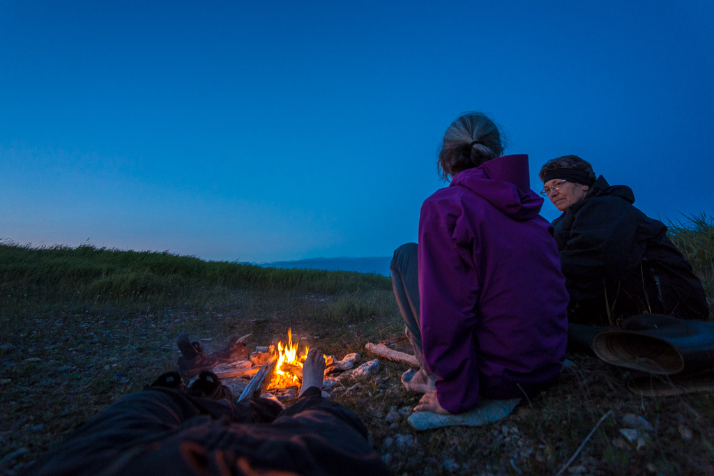 Je rejoins mes compagnes de voyage au camp. Après des heures à porter mon sac à dos et ensuite ma caméra, mon dos me fait mal. En enlevant mes chaussures mouillées, mes pieds « fument » près du feu. Quand on parle, on fait aussi de la buée. Je n'ai pourtant pas l'impression qu'il fait si froid, mais ça fait comme en hiver. Je me réchauffe les pieds, change mes bas et mets les sandales trop petites de Danièle (elle porte du 8) pour rester au sec pour la soirée.